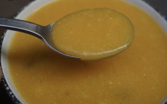 주걱으로 저었을 때 자국이 천천히 사라지면 딱 좋은 농도예요. 너무 되직하면 물 조금 더 넣으시고, 묽으면 좀 더 끓여주세요.